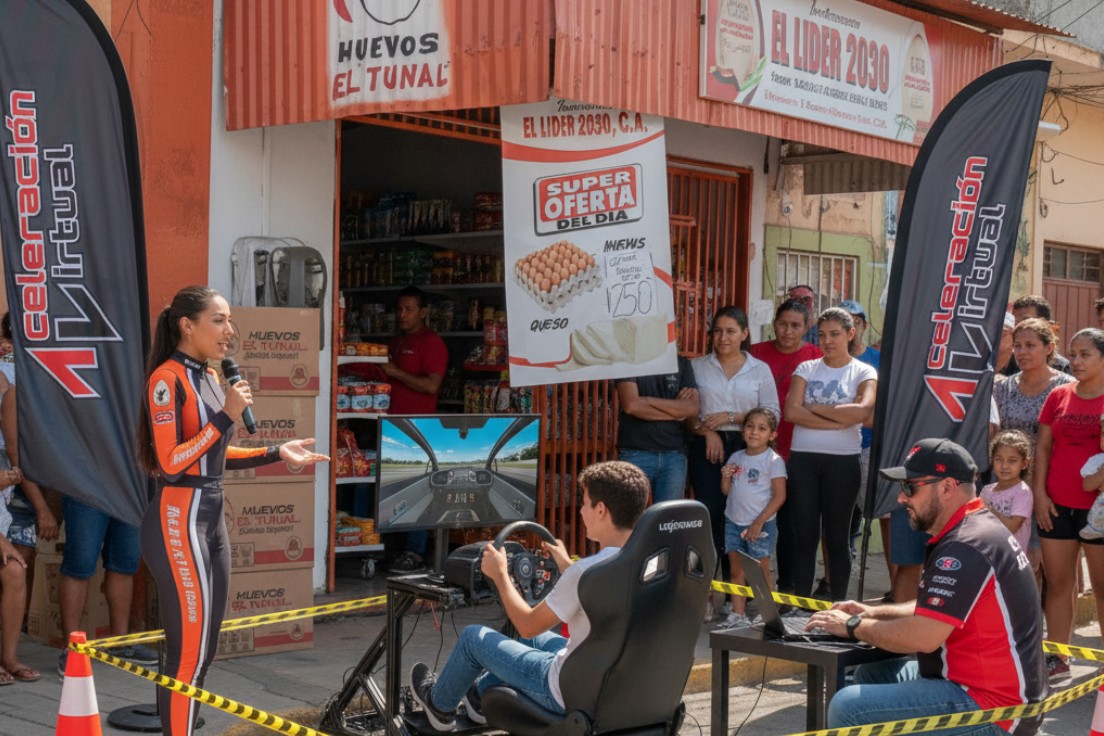 Personaliza cada detalle de la exhibición: desde los autos en el simulador hasta la pista. Refuerza utilizando tus herramientas como carpas, pendones, promotoras o cualquier otra herramienta de publicidad que tengas, asegurando que tu marca tenga una presencia visual poderosa.